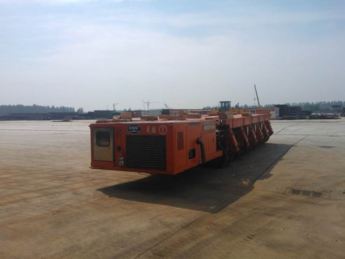 整車寬度 2.43m,是一種配備了液壓升降、液壓驅動轉向、液壓驅動行走的特種車輛,用于重型貨物的場地內周轉運輸,有橫向駕駛、普通、前軸轉向、后軸轉向、 斜向、角向 90°、原地轉圈七種轉向模式。車輪大轉角±110o。每軸線總質量 48t,每軸線載質量 43.5 t。配備無線遙控器(也可有線使用)。 液壓管路、電氣電纜連接均采用液壓快速接頭和電氣連接器,可多車并車,效率高。