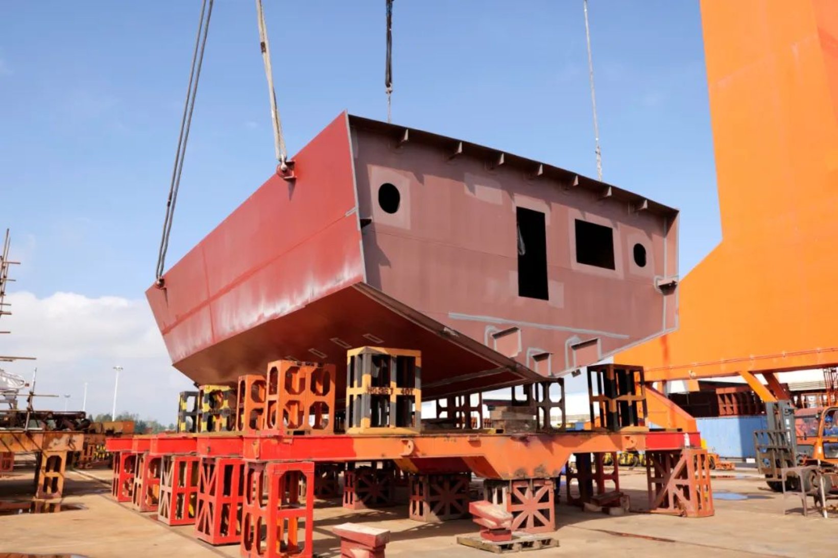 10月8日,由武昌造船為連云港市海洋與漁業(yè)綜合行政執(zhí)法支隊(duì)打造的新建300噸級(jí)漁政執(zhí)法船,在監(jiān)理、項(xiàng)目三總師及參建單位相關(guān)負(fù)責(zé)人的見證下,順利上船臺(tái),標(biāo)志該船正式進(jìn)入船臺(tái)搭載階段。