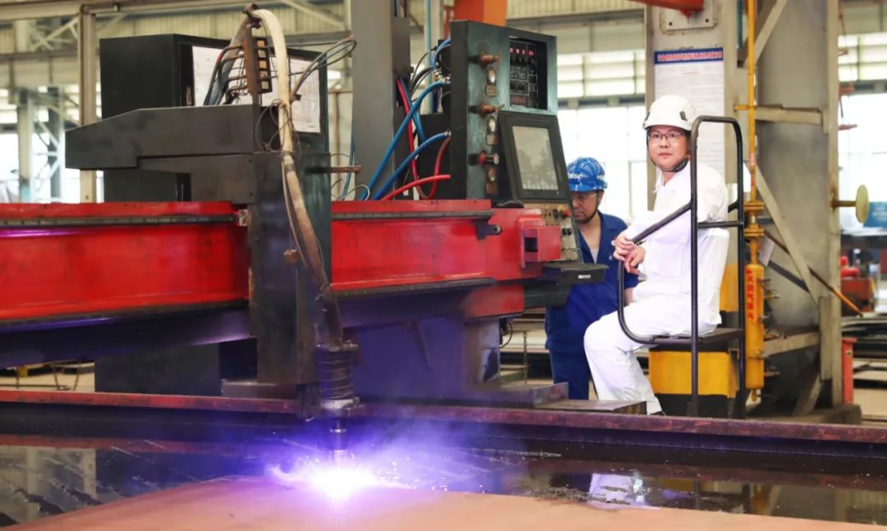 開工儀式上,船東代表蔣祥林先生按下切割機按鈕,切割機徐徐移動,火焰迸發,第一塊鋼板按照圖紙尺寸開始切割,這也標志著公司承接的6艘1100TEU集裝箱船已全部開工。