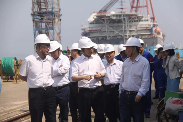 李冰一行來到青島武船碼頭生產(chǎn)區(qū)域,實(shí)地查看了正處于系泊試驗(yàn)階段的4型5艘海工產(chǎn)品,并現(xiàn)場(chǎng)聽取了生產(chǎn)建造進(jìn)展情況。