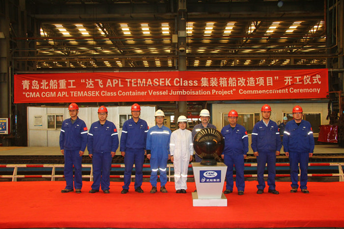 4月2日下午15點58分,武船集團北船重工“達飛公司系列集裝箱船升級改造項目”開工儀式在北船重工造船聯(lián)合廠房順利舉行。法國達飛輪船公司改裝項目現(xiàn)場經(jīng)理MR.JAN IVERSEN,DNV-GL船級社高級驗船師包青波,北船重工副總經(jīng)理于寶月、劉玉東及總經(jīng)理助理丁福增,北船重工造船相關(guān)部門和修船分廠的領(lǐng)導(dǎo)出席了儀式。