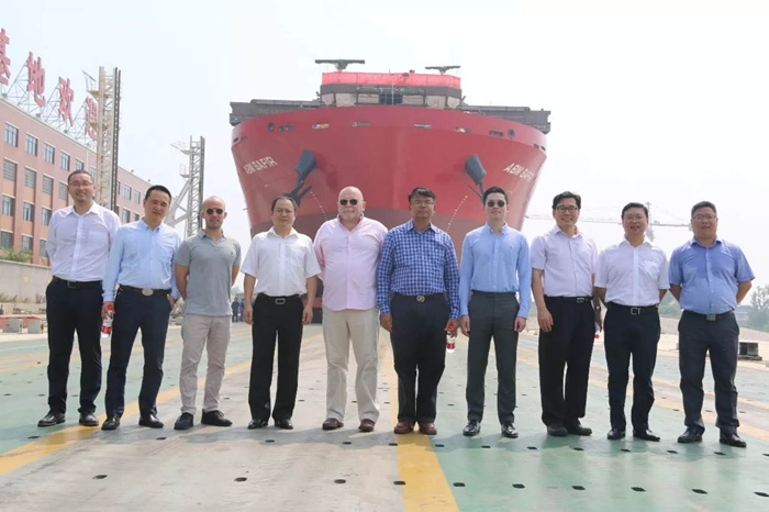 7月24日上午10時18分,烈日炎炎,彩旗飄動,由雙柳武船承建的13000DWT甲板運(yùn)輸船最后一艘4號船在雙柳基地下水。船東代表法國路易達(dá)孚海運(yùn)集團(tuán)公司艾米力?杜,武昌船舶重工集團(tuán)有限公司副總經(jīng)理田軍,武船集團(tuán)雙柳武船黨委書記、董事長楊國平等參加了下水儀式。4號船的順利下水,標(biāo)志著在雙柳武船全體員工努力下,在設(shè)計(jì)師、工程師和驗(yàn)船師的積極幫助下,13000DWT項(xiàng)目進(jìn)入全面收官的關(guān)鍵沖刺階段。