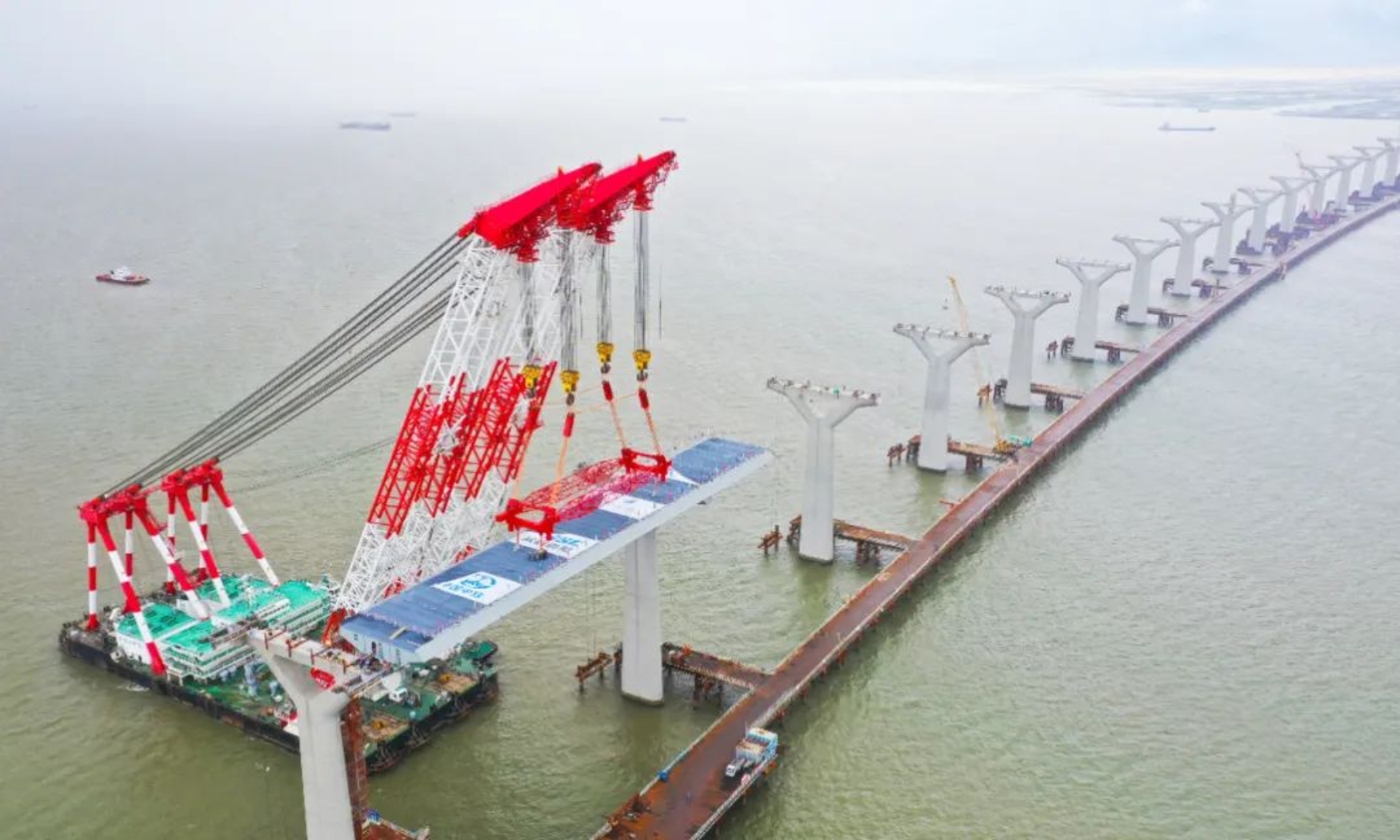 中國船舶集團武昌造船重工公司承接的黃茅海跨海通道G2合同段中引橋為為1600米鋼箱連續梁橋,左右幅分離,鋼箱梁大節段共32節,現場采用半幅大節段吊裝方式進行吊裝。本次吊裝的大節段長123米、寬18.75米、高4米、重1340噸,是全橋最大、最長、最重的6節大節段之一。