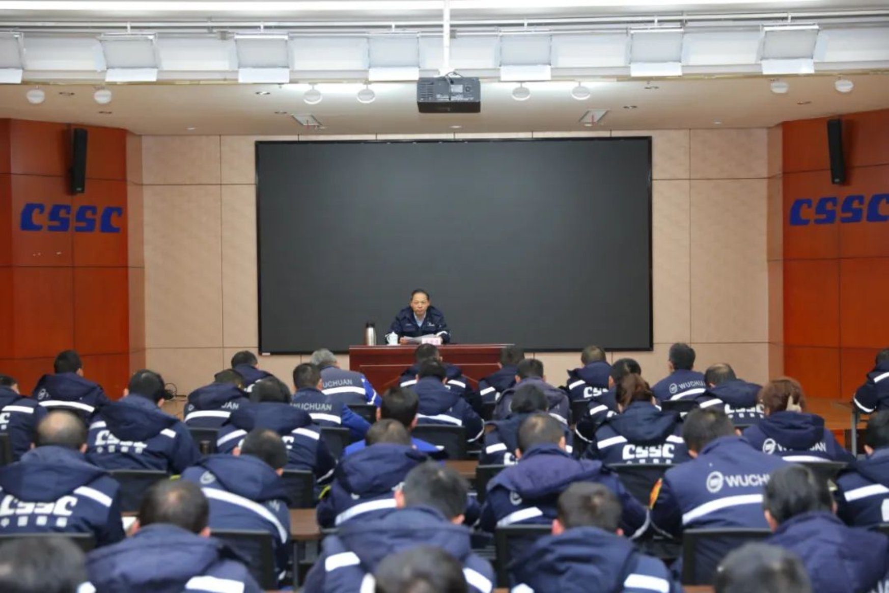 2月21日晚,中國船舶集團武昌造船黨委副書記、總經理梁師清在創新樓12樓武船講堂為民船戰線的黨員干部講授形勢任務主題黨課。船舶總裝部、涂裝工程部和起運工程部的中層管理人員、基層管理人員、黨員代表參加黨課學習。