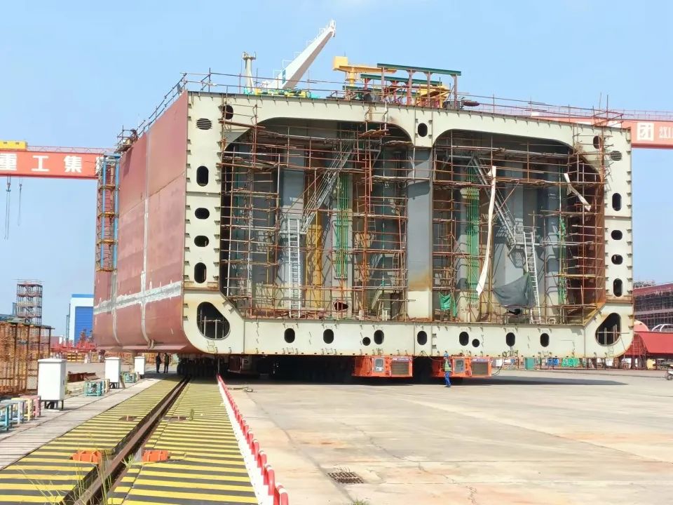6月14日,該船一號環(huán)段總組順利轉(zhuǎn)運;6月29日,二號環(huán)段總組順利轉(zhuǎn)運,7月6日,三號環(huán)段總組順利轉(zhuǎn)運……一個月內(nèi),快速精準形成2號船主船體,船臺周期相較一號船進一步縮短2個月。